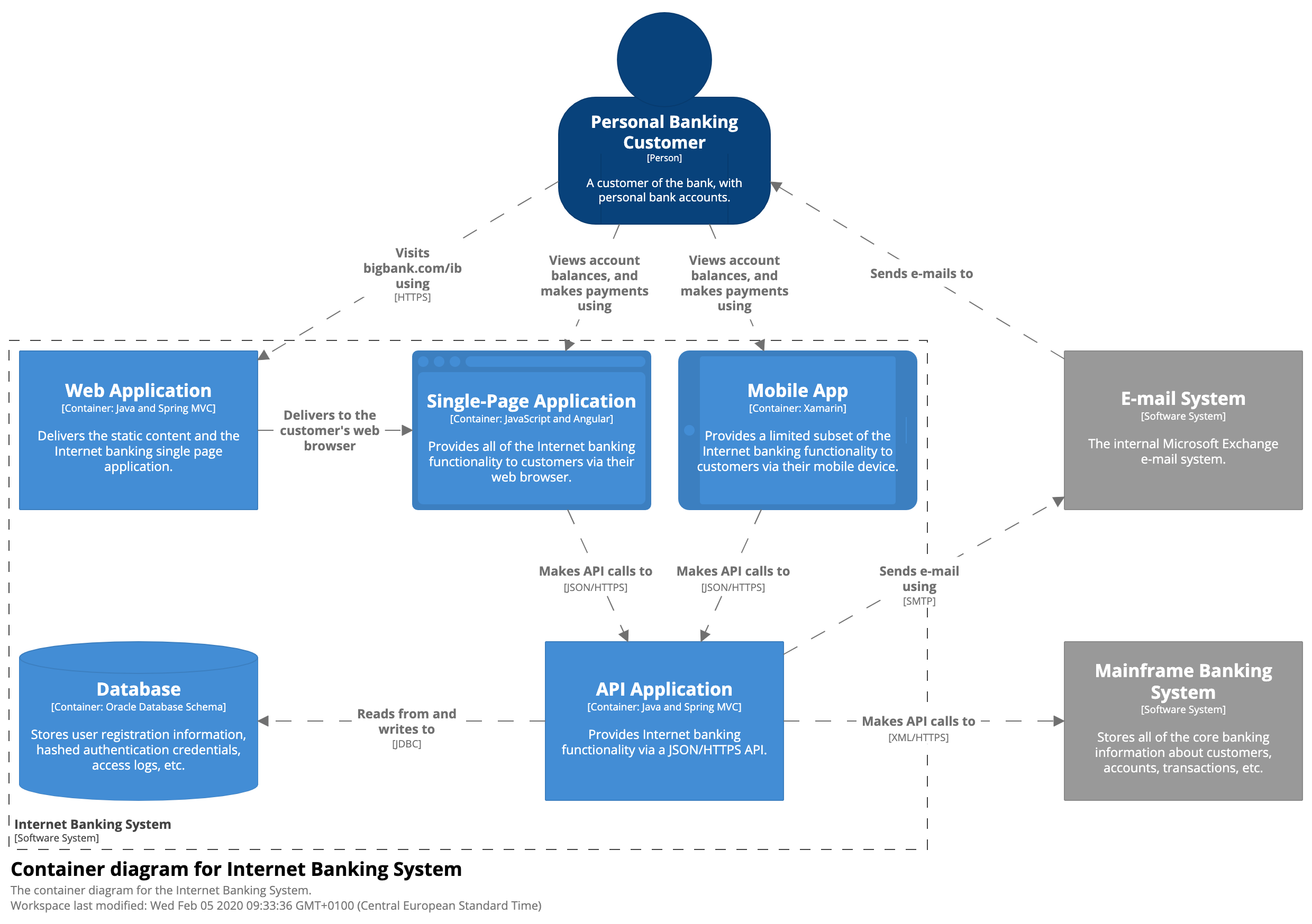 This here is the genius of the approach, by limiting the detail you go into so it's focused on a singular part of the wider system, it helps reduce the complexity whilst still showing in what context you are working. You could then have multiple Container views, one for the Internet Banking System, one for the Email System and one for the Mainframe Banking System.