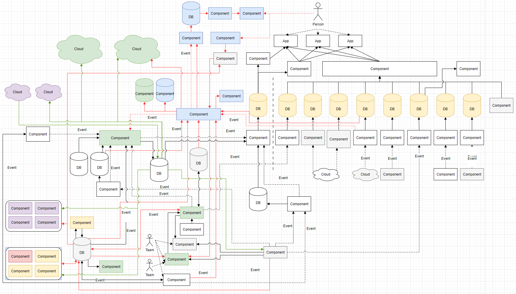 However as that engineer that has just joined the team, this diagram is daunting, scary even. It would require study, multiple questions, and long discussions on the context that the diagram leaves out. It is also only a subset of a wider system; where does it sit in relation to other components in our company? What would it look like if we attempted to diagram the whole organisation's architecture like this? (a mess most likely!)