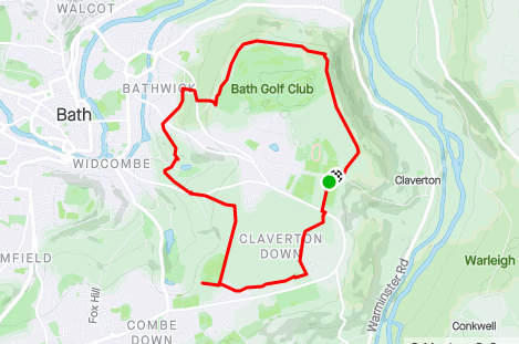 Starts at the Bath University car park, then takes you across the commons of Bath & through local woodlands. About 2/3s in takes you closer to town, ideal for a detour to the shops for a break.